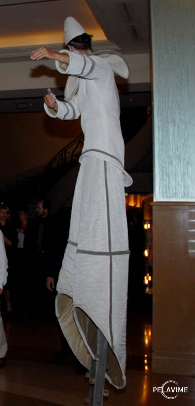 En accord avec le président, à la toute fin de sa conclusion, entre par le fond de la salle un personnage sur des échasses : il indique à l’orateur qu’il souhaiterait accompagner le public et les orateurs ailleurs pour prolonger la convention.