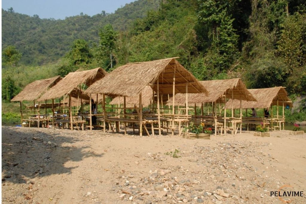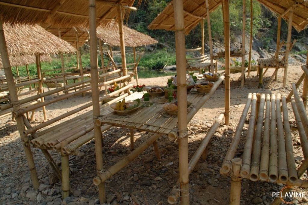 Tous les matériaux utilisés sont trouvés sur place. Ni vis, ni clou, ni colle : juste des cordages et des bambous pour agencer les tables, chaises et toits.